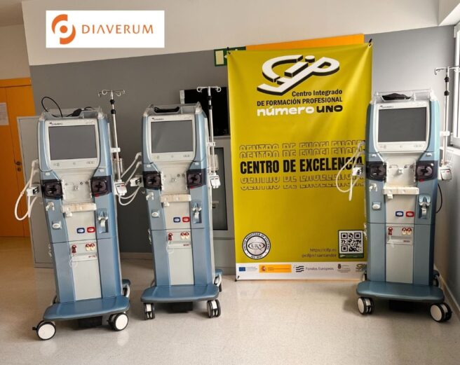 El equipo educativo de Electromedicina Clínica ha acudido a recoger tres equipos de hemodiálisis cedidos por la empresa Diaverum.