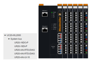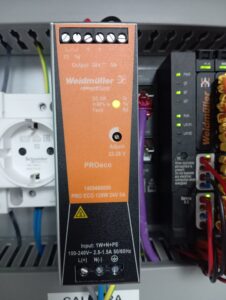 En el esquema eléctrico y encima a la izquierda del PLC Weidmuller vemos un bloque naranja que será su fuente de alimentación de 24 V de la misma marca.