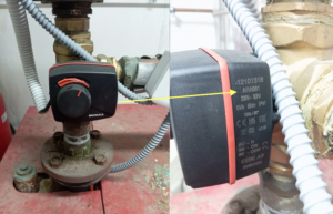 Estas válvulas están instalas en el falso techo de las aulas o en la entrada del radiador en el caso del departamento de electrónica. Las que se han instalado son válvulas, con referencia 30223200, de dos vías con conexión de tubo 3/4″ Hembra con micro fin de carrera  de zona no desmontables para funcionar como reguladores todo-nada.
