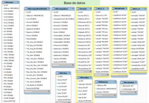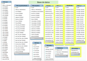 La base de datos utilizada es MySQL. Se encuentra ubicada en el NUC (192.168.13.2) en el puerto 3306. El nombre del esquema es BaseDatos y consta de las  tablas en amarillo que cumplen  funciones en este apartado de funcionamiento de caldera y su gráfica:
