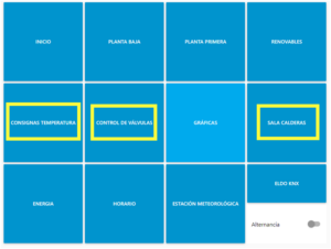 Estos son los botones del dashboard del edificio de electricidad electrónica en los que se pueden realizar las configuraciones que se explican arriba y visualizar la sala de calderas.