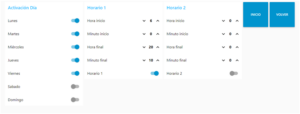En el botón de horario programado se reflejan y configuran los horarios de mañana y tarde laborales o desactivación de horarios en el caso de vacaciones: