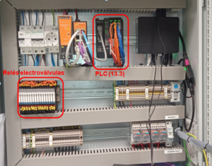 Este PLC 13.3 consta de 1 módulo de 16 salidas digitales, 14 de las cuales (de la 0 a la 13)  se utilizan para activar y desactivar los 14 relés que actuarán sobre las electroválvulas,  y 1 módulo de comunicaciones serie RS-485 para las señales Modbus RTU de los paneles solares y del medidor de energía.