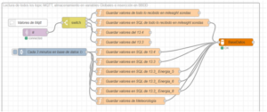 En este flujo, se reciben todos los topics enviados por MQTT de los PLCs 13.3 y 13.4 y su información se almacena en variables globales y en la base de datos.