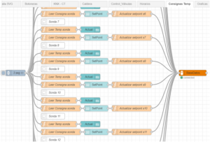 En este flujo se consultan los valores actuales de las sondas ubicadas en las aulas, y el valor actual de las consignas de temperatura. En función de estos valores, de la histéresis de medio grado y del estado manual/automático se actúa abriendo o cerrando la electroválvula del aula correspondiente. La programación está descrita en el apartado aulas.