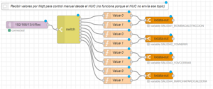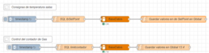 En este flujo se obtienen los valores de las entradas y salidas del PLC y se almacenan en variables globales y a continuación se envían por MQTT con el topic “’192/168/13/4/Send’” para que el NUC disponga de los valores en tiempo real del estado de la sala de calderas (entradas, salidas, variables de consumo de Gas).