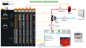 Hemos explicado la interrelación de cuatro de las cinco tablas de la base de datos con la apertura y el cierre de las válvulas, faltaría explicar en detalle lo que es el corazón de la calefacción, la sala de calderas, el PLC 13.4 que está ubicado en esta sala, su comunicación con el NUC y los valores que se almacenan en la base de datos MySQL del NUC en la tabla tb13_4.
