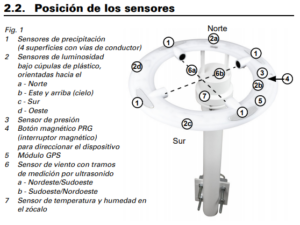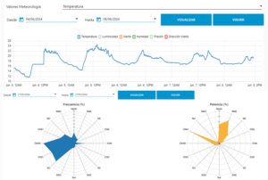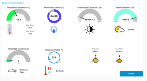 Ofrece valores, en tiempo real, de temperatura, humedad, luminosidad exterior, presión atmosférica, velocidad y dirección del viento y por último las horas del amanecer y el anochecer, estas dos se obtienen de un servidor externo gratuito «Openweather». Estos valores son mostrados en las pantallas de los pasillos y a través de la web de controles general.