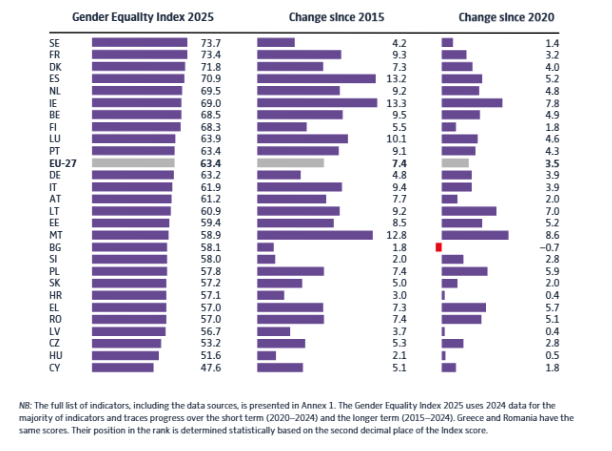 Buenas noticias: España se sitúa cuarta en el ranking europeo, con 70,9 puntos, por detrás de Suecia, Francia y Dinamarca, y muy por encima de la media europea (63,4). Además, destaca en avances en representación política y toma de decisiones.