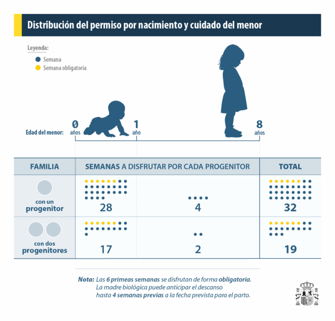 Las seis primeras semanas se disfrutan de forma obligatoria e ininterrumpida a jornada completa inmediatamente después del nacimiento del bebé o, en el caso de adopción, guarda o acogimiento familiar a partir de la resolución judicial o administrativa. La madre biológica puede anticipar el descanso hasta las cuatro semanas previas a la fecha prevista para el parto.
